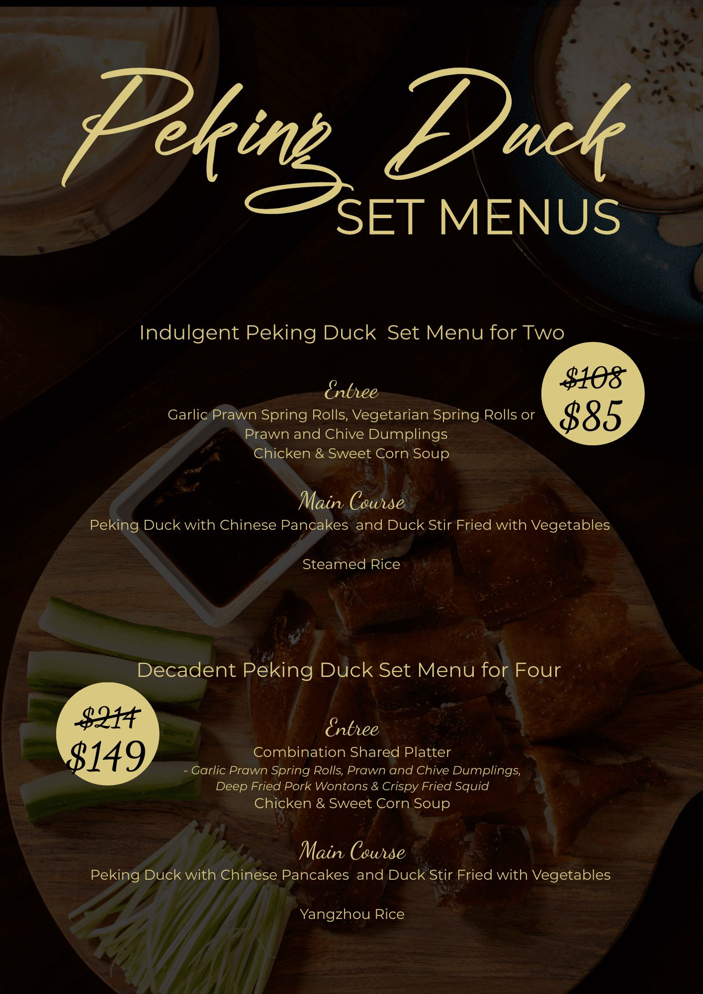 Peking Duck, pancakes & all the good stuff.Two set menus to choose from, starting at $85 for two people.Bookings are essential (with atleast 24 hours notice) beacuse that crispy goodness takes time!